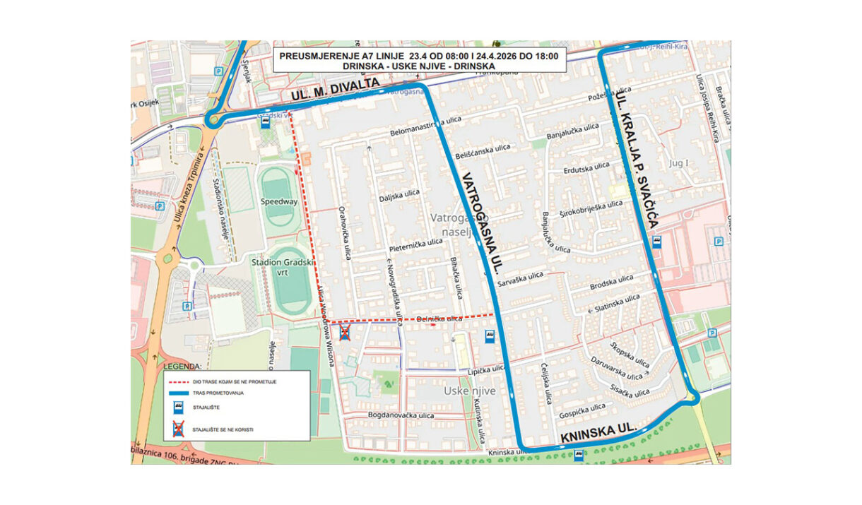 Zbog izvođenja radova u Ulici W. Wilsona u Osijeku, od četvrtka 23. travnja u 08:00 sati do petka 24. travnja 2026. u 18:00 sati, za